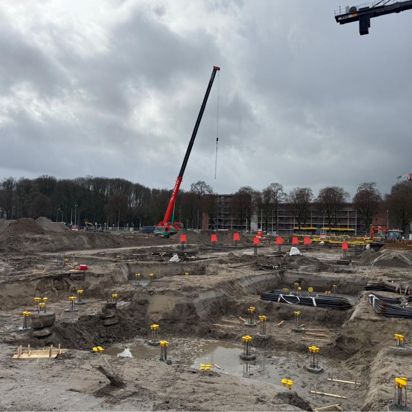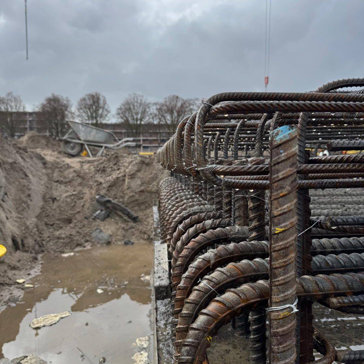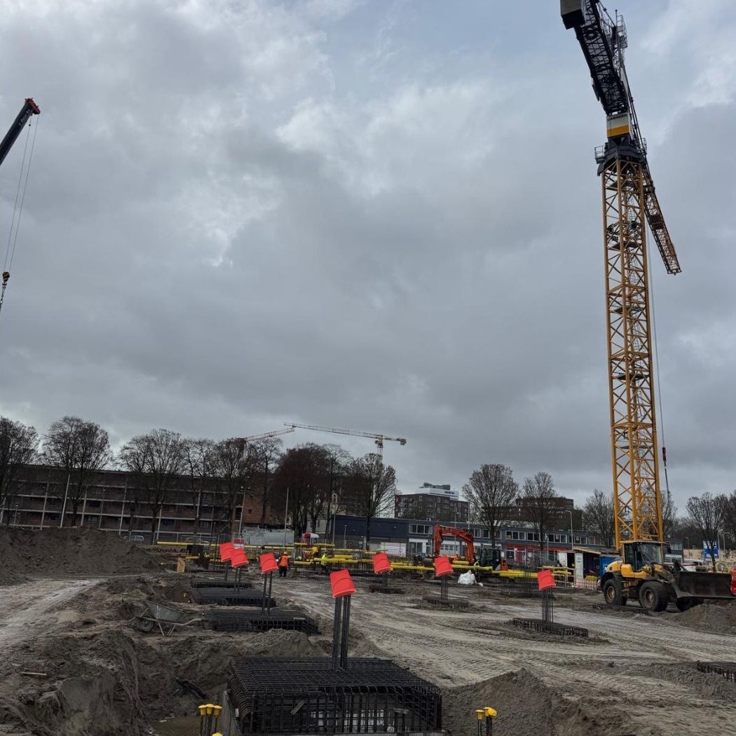 Momenteel zijn we volop bezig met de funderingswerkzaamheden; balken, poeren, putten en kraanpoeren van de begane grond. We zijn inmiddels halverwege de fundering en starten volgende week (week 13 – 2026) met de begane grond vloer.