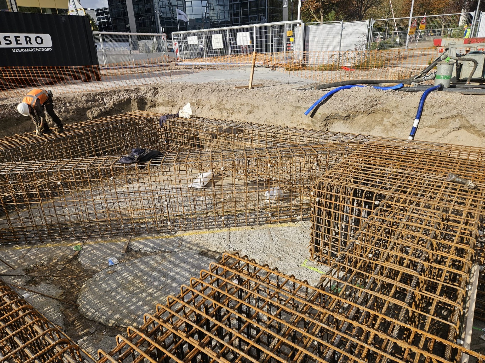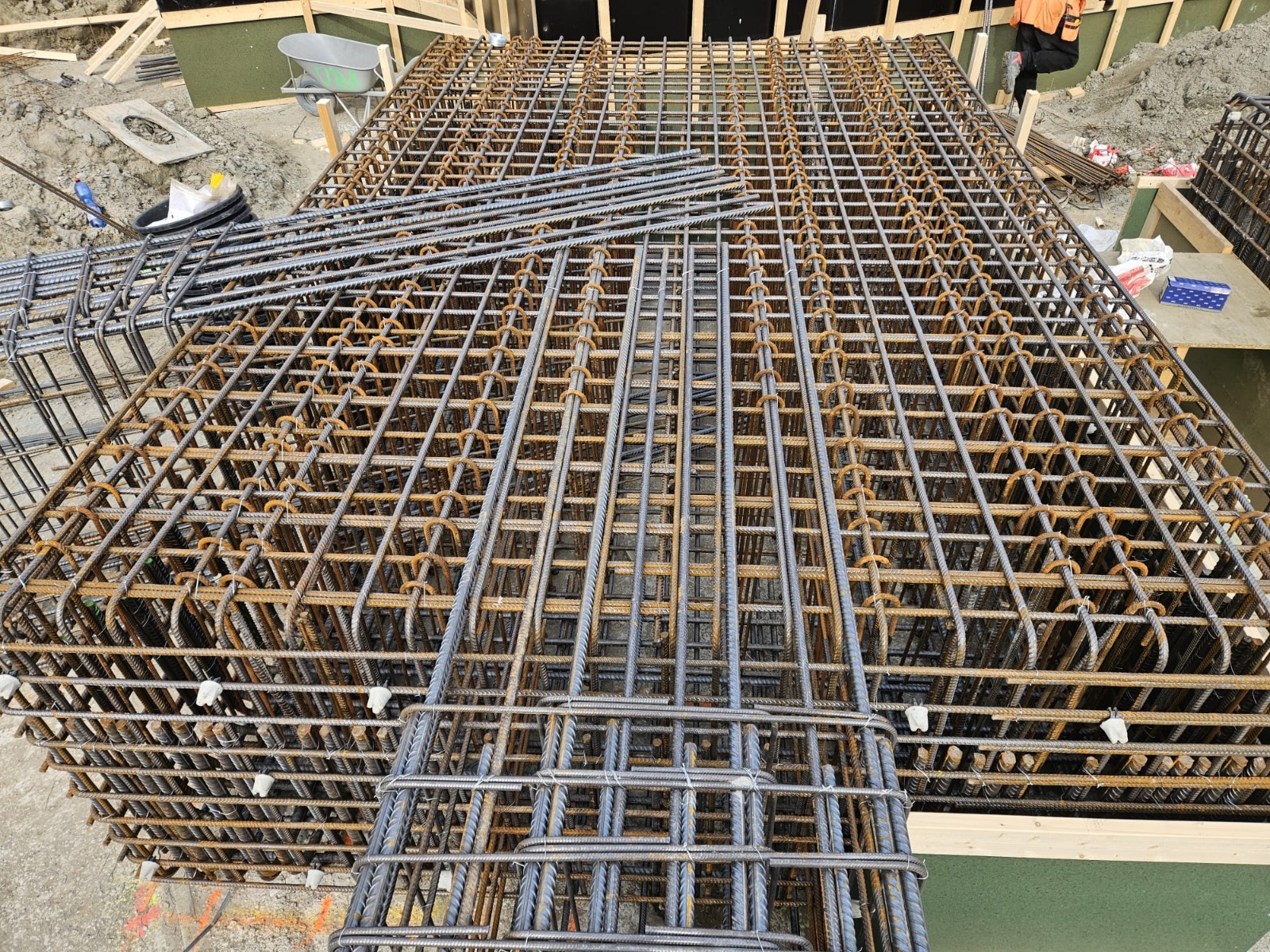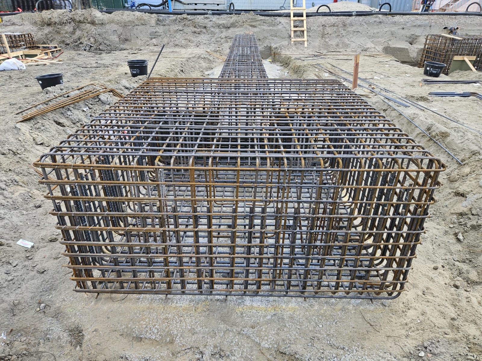 Op dit moment (week 47) zijn wij bezig met het laatste deel van de fundering. Vanaf september 2025 hebben we ca. 200 ton wapening geleverd en verwerkt. Voor de kerst leveren en verwerken wij de druklaagwapening op de begane grond, waarna wij aansluitend ook starten met de eerste wandwapening.
