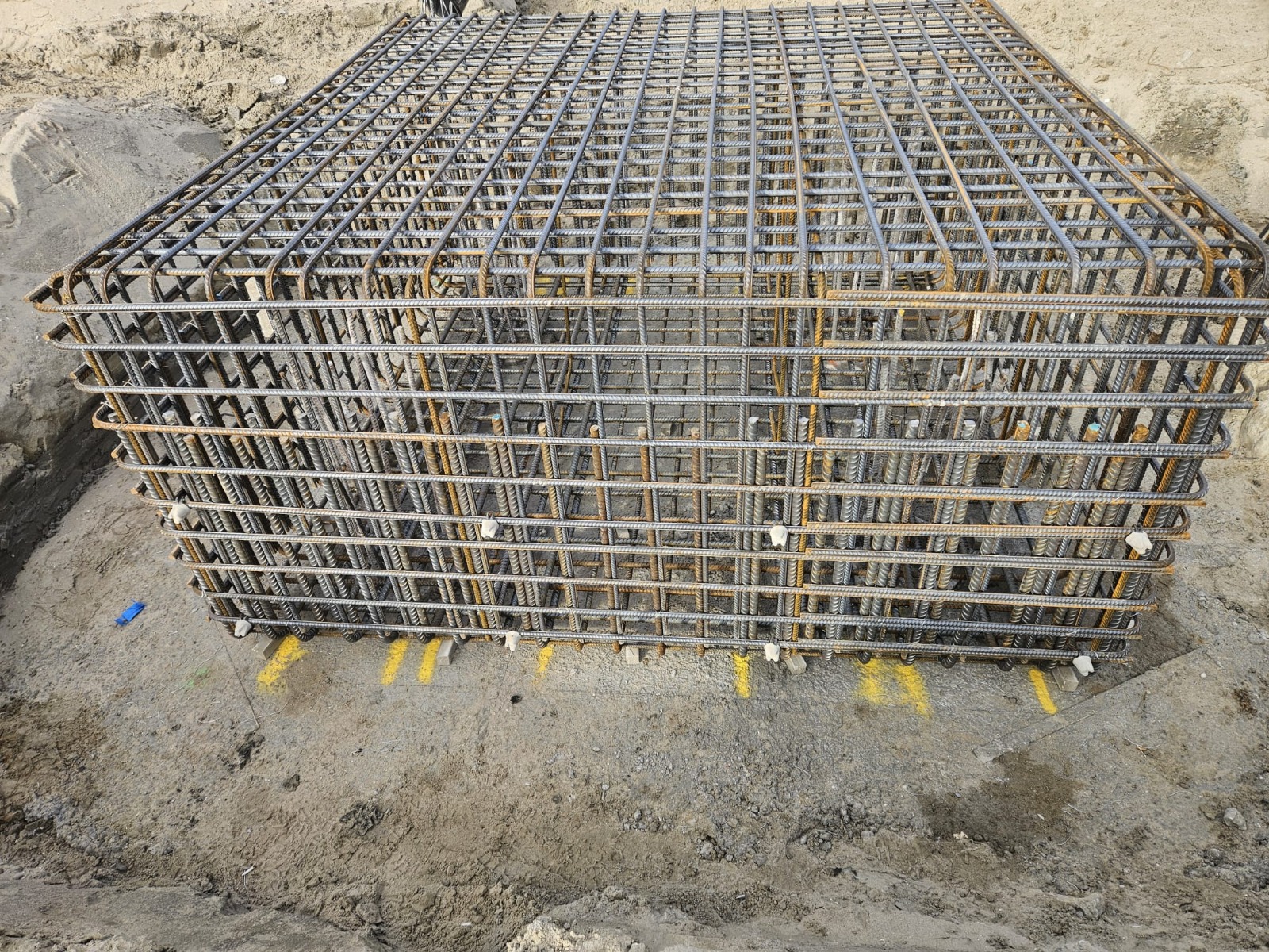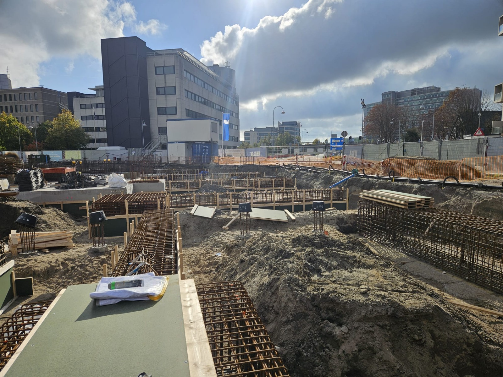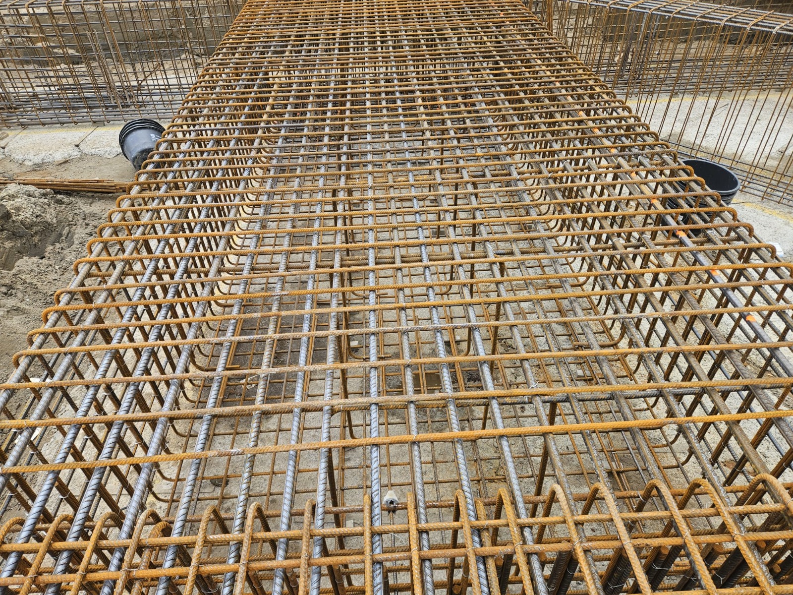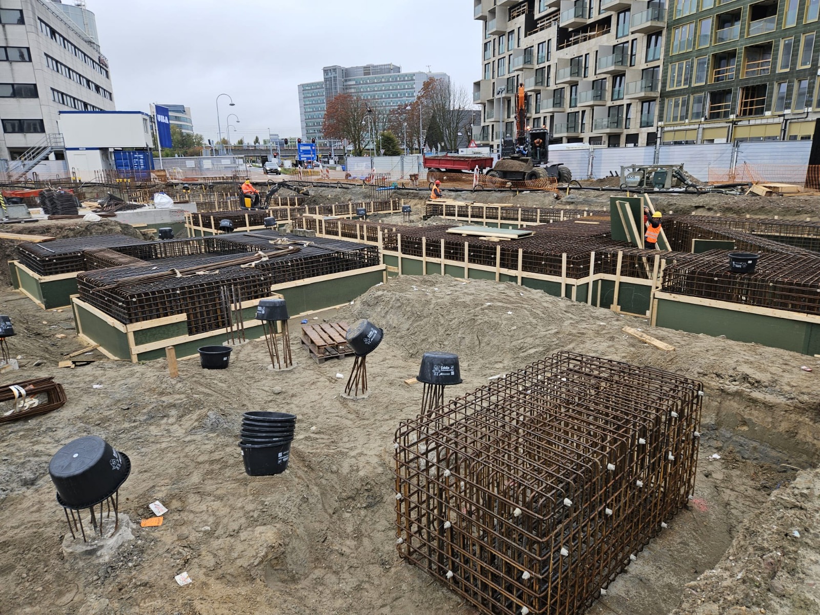 Op dit moment (week 47) zijn wij bezig met het laatste deel van de fundering. Vanaf september 2025 hebben we ca. 200 ton wapening geleverd en verwerkt. Voor de kerst leveren en verwerken wij de druklaagwapening op de begane grond, waarna wij aansluitend ook starten met de eerste wandwapening.